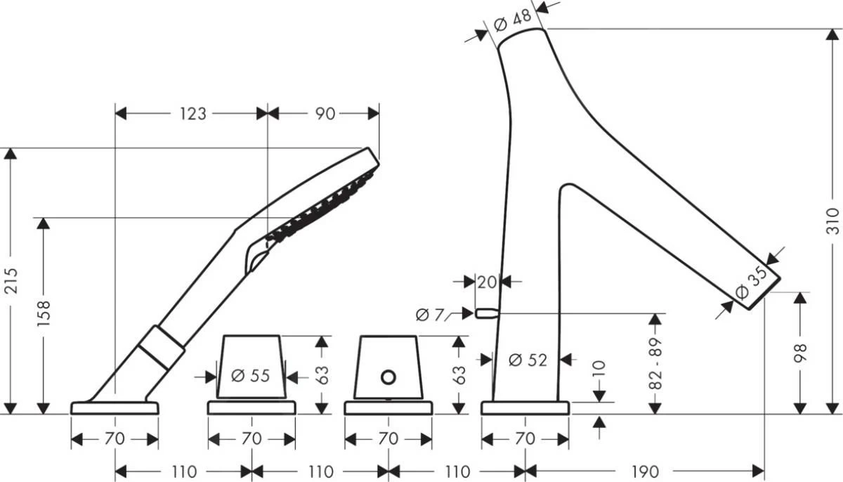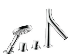 - bevat handgreep, thermostatische cartridge, stopkraan, baduitloop met omstelling en Axor handdouche met 3 straalsoorten #26050xxx