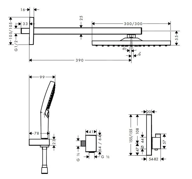 Deze Raindance E design doucheset is ontworpen in een boeiende matzwarte kleur. Het omvat een hoofddouche van 300 x 300 mm met één type douchestraal – de ontspannende RainAir. Per minuut stroomt 17,1 liter water door de hoofddouche. De hansgrohe Raindance E doucheset is verder uitgerust met een Raindance Select S handdouche met een diameter van 125 mm. De douchekop biedt drie straalsoorten – zachte PowderRain, verkwikkende Rain en krachtige Whirl. Tussen de stralen kun je dan soepel schakelen middels de innovatieve Select-knop en zo gewoon alleen maar van jouw douche genieten. De set bevat ook een hansgrohe ShowerSelect thermostatische inbouwkraan voorzien van een beveiliging tegen verbranding. Ook de inbouwkraan is voorzien van twee Select-knoppen voor makkelijke en intuïtieve bediening. Het douchesysteem wordt gecompleteerd door een FixFit Square muuraansluitbocht, een aparte Porter E handdouchehouder met een Isiflex doucheslang van 1250 mm. De set wordt geleverd inclusief een compatibele iBox inbouwdeel.