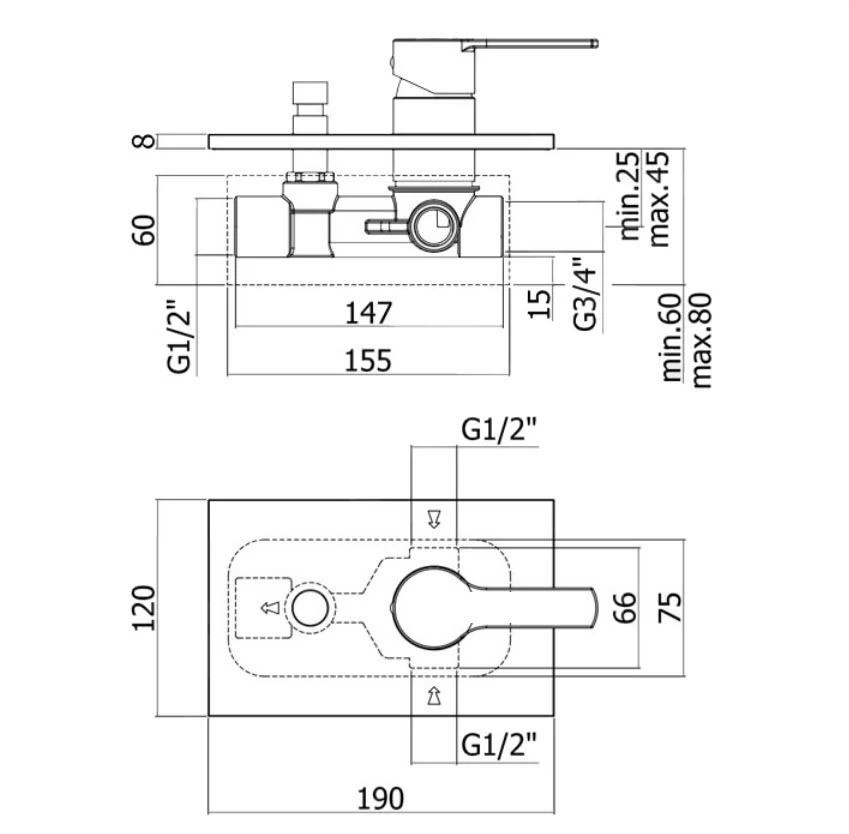 Eengreeps inbouw douchekraan met inbouwdeel en omstelling.